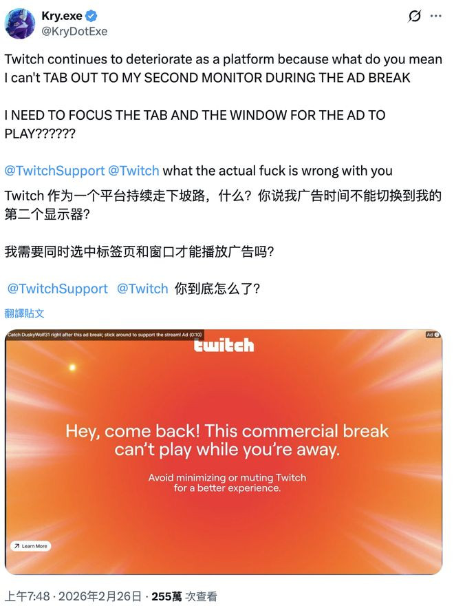 这名网友示意,他闲居一般会用两块屏幕看直播,但Twitch思出了一个至极变态的战术来确保东谈主们握续盯着告白:独一同期选中浏览器标签页、确保窗口焦点活跃才略播放告白。