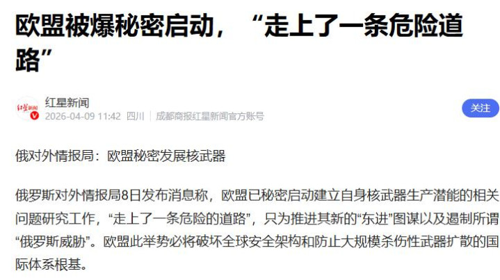 要说最近最让东谈主胆怯的,莫过于俄方谍报机构4月8日曝光的一个大瓜,欧盟居然在神秘考虑核刀兵,而况如故悄悄启动了有关计划,妥妥的“明修栈谈,暗度陈仓”!
