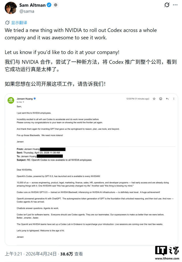 山姆·奥尔特曼称在GPT-5.5模子上,OpenAI和英伟达高度互助,膨胀Codex到英伟达全公司,并晒出了和黄仁勋的交流邮件: