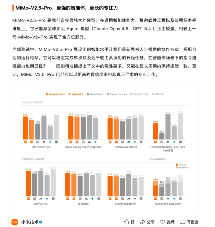 其中,旗舰型号MiMo-V2.5-Pro被定位为“为长难Agent任务而生”。据官方泄露,在通用智能体、复杂软件工程等维度上,其推崇已可对标Claude Opus 4.6、GPT-5.4等公共头部模子。