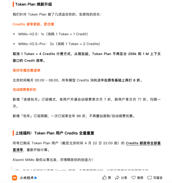 此外,官方还对Token Plan订价决议进行了优化。取消1Token=4 Credits计费神态,从现时起Token Plan不再分辨256k和1M高下文窗口的Credit倍率。此外,新增“相连包月”“包年”的订阅形态。