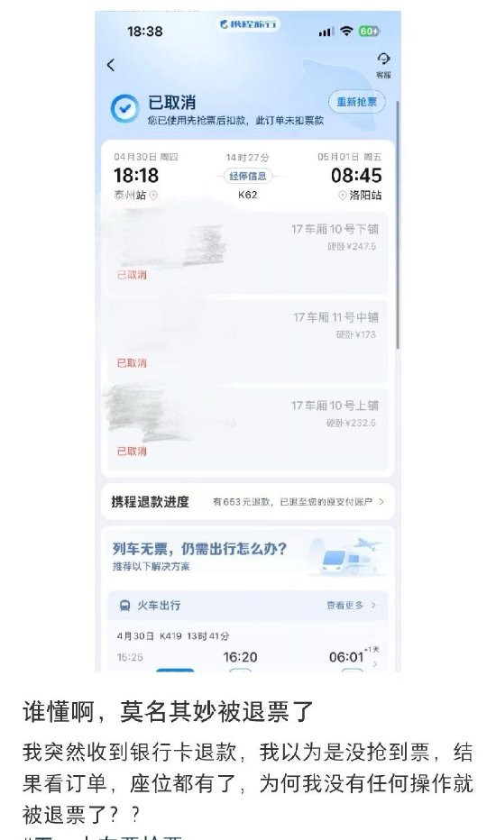 (有乘客响应在携程购火车票后被无故退票)