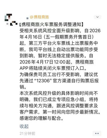 之后有携程商旅用户响应,收到携程商旅使命主谈主员见知,称“受研讨系统风控全面升级影响,自2026年4月16日(五一假期票务开售首日)起,第三方平台火车票线上出票奇迹中断,我司平台线上自动出票功能同步受到影响,暂时无法见解提供奇迹。自2026年4月17日12:00起,携程商旅APP将赓续关闭火车票预订进口。”携程商旅还提议,okooo澳客APP官方网站优先通过“12306”官方渠谈自行购票后报销。