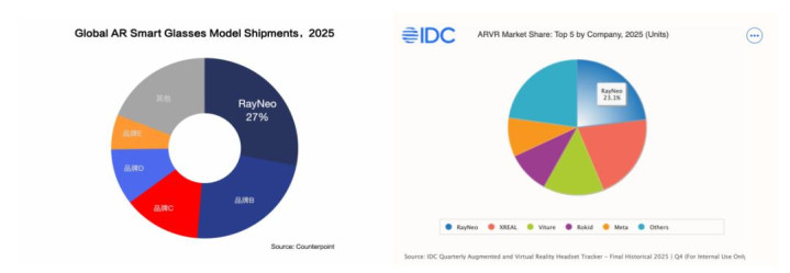 这组数据究竟多有重量?Counterpoint给出最直不雅的谜底:雷鸟鼎新拿下2025年全球AR眼镜出货量头把交椅,市集份额高达27%。换个说法更颤动——全球AR眼镜的“天地”,雷鸟已占近三分之一。IDC的数据则更具“含金量”,在全球竞争最为尖锐化的中好意思市集,雷鸟以压倒性的上风排在了Meta前边,北好意思涨幅更是达到了惊东谈主的456.5%。这不是低调渗入,而是奏凯杀入Meta的大本营,与北好意思巨头正面掰手腕。