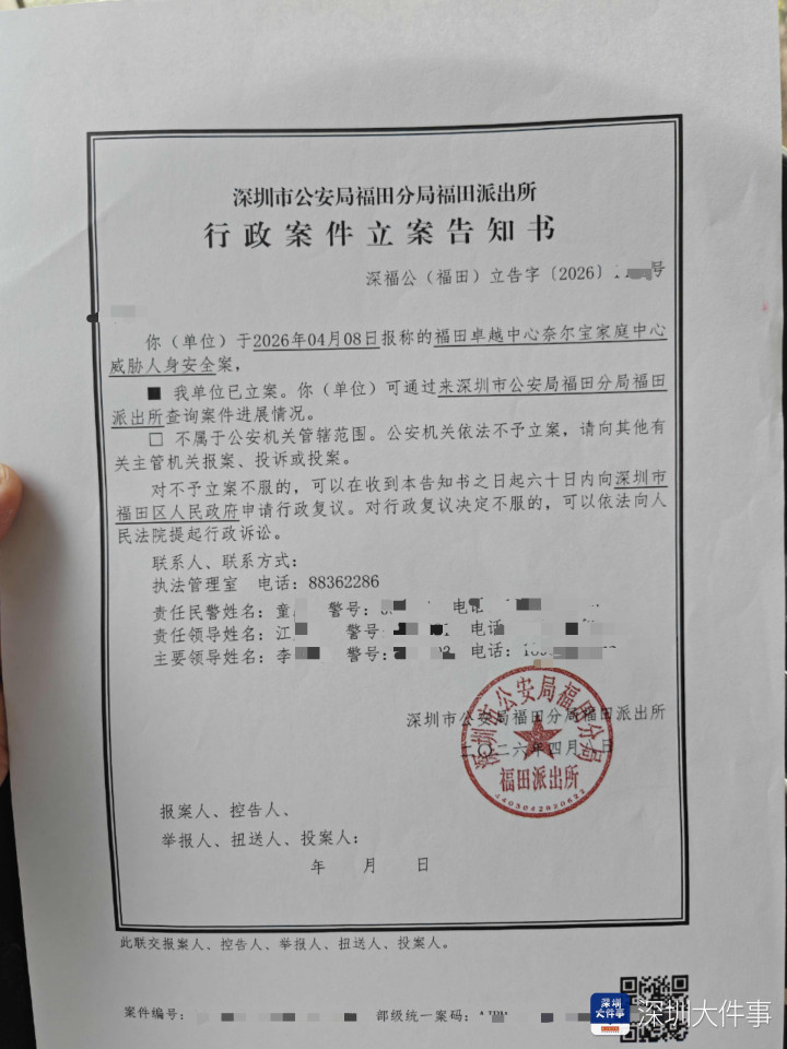 刘先生暗意,4月7日事发本日地午,其报警后便与相干当事东谈主一同到福田派出所作念了笔录,随后收到广东省公安法医学活体检修温存录用登记表。并于第二天,带着小孩到宝安区第二东谈主民病院规矩温存所验伤。4月9日上昼经过主动交涉,拿到了警方给出的报警回执以及行政立案汇报书。