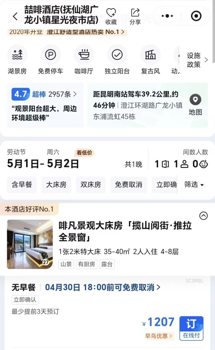 还有网友发文吐槽,位于抚仙湖广龙小镇的一家喆啡货仓,平时价钱为200元操纵,4月30日晚初始,价钱涨到2508元,加价十倍以上。4月23日,平台上抚仙湖临近货仓价钱均较为平日,喆啡货仓广龙小镇店5月1日晚的价钱照旧降到1207元,价钱“腰斩”。